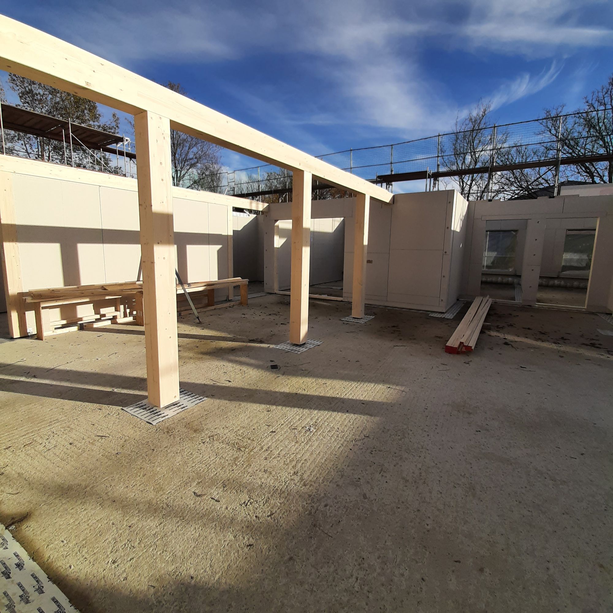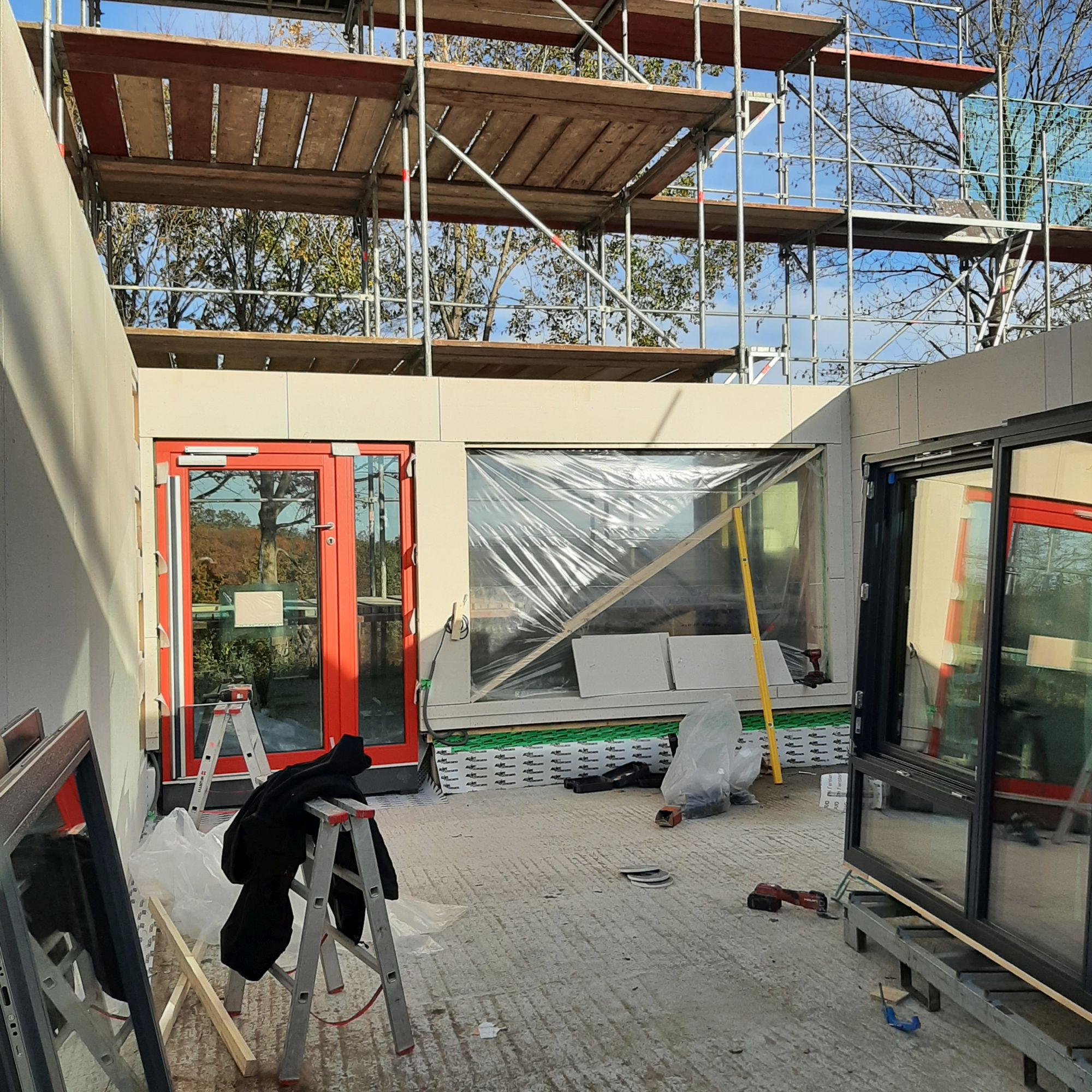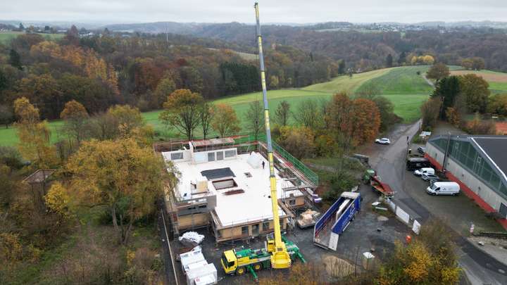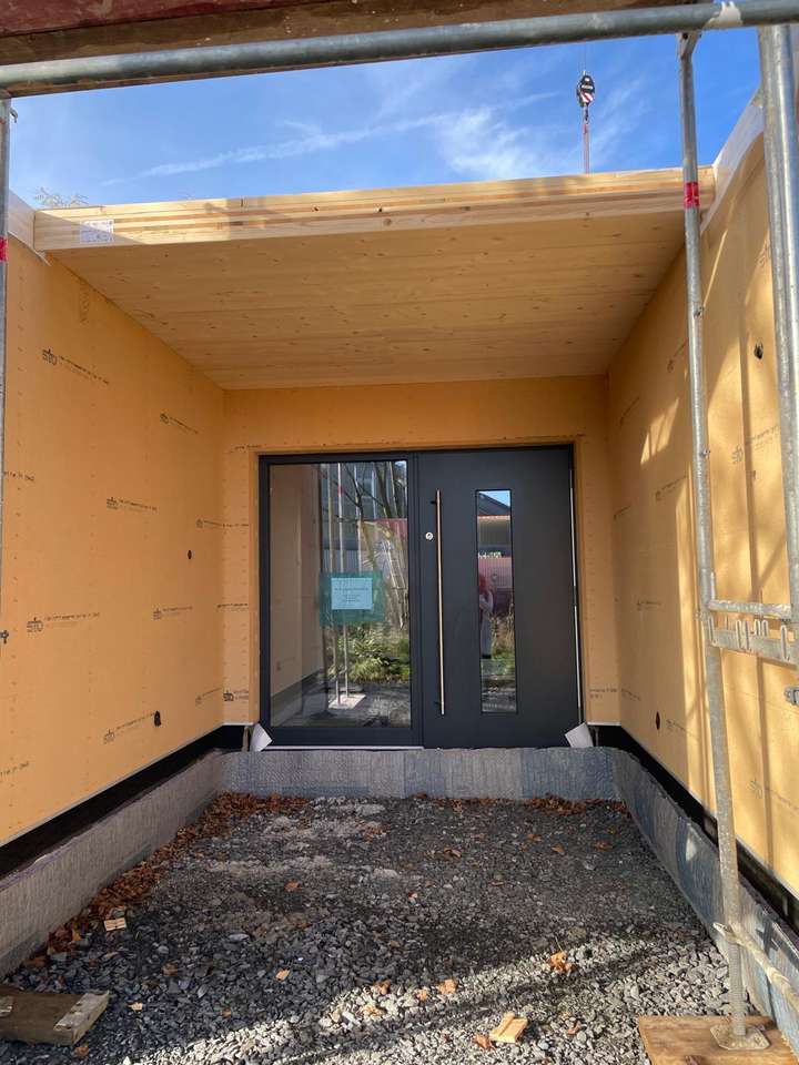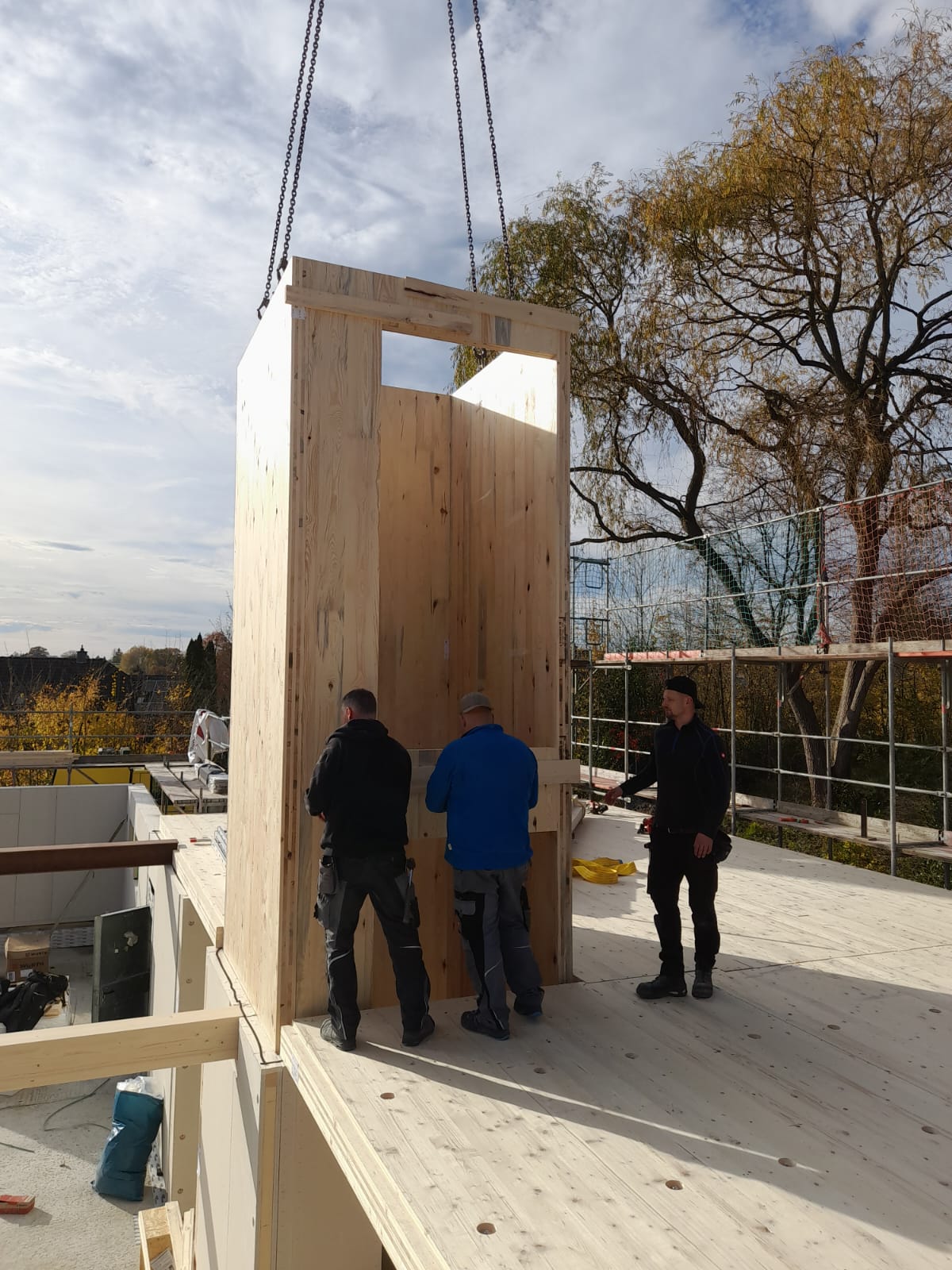 Am 03.11.25 wurden die ersten Wandelemente für das Erdgeschoss durch die Firma Stommel Haus GmbH montiert: